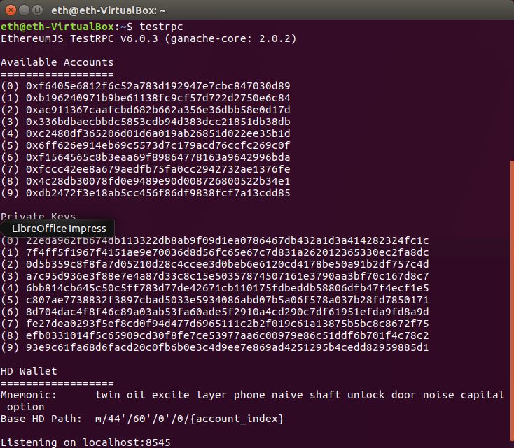 Para comprobar que todo funciona correctamente usamos el comando: testrpc. Este comando nos mostrara un listado de llaves públicas y privadas de wallet de etherum que podremos usar en las aplicaciones que desarrollemos.