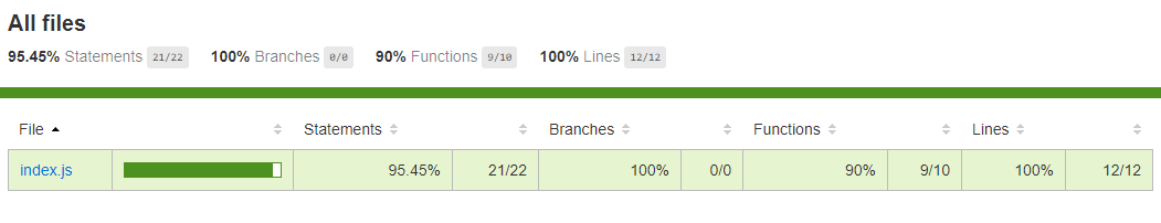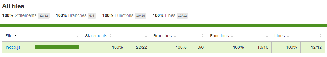 ----------|----------|----------|----------|----------|-------------------| File | % Stmts | % Branch | % Funcs | % Lines | Uncovered Line #s | ----------|----------|----------|----------|----------|-------------------| All files | 100 | 100 | 100 | 100 | | index.js | 100 | 100 | 100 | 100 | | ----------|----------|----------|----------|----------|-------------------|